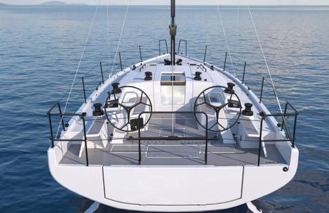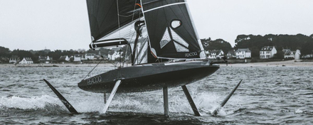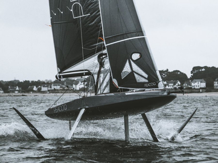 Un peu plus court que ses compatriotes (4.20m) le Peacoq ne passe pas pour autant inaperçu avec son design futuriste. Ce dériveur sportif en double, est un pur produit des Pays de la Loire, même si le design et les études sont signées MMProcess à Quiberon. Mais c’est bien à Piriac sur Mer (44) que Foily les construit avec l’ambition de « donner à tous les amateurs de voile l'occasion de découvrir les sensations fortes du vol sur l'eau." Les vitesses annonces ont en effet de quoi enthousiasmer. Le bateau décolle dès 7-8 nœuds de vent en solo, 10-12 nœuds en double et là, le speedo s’affole, atteignant 18-20 nœuds au travers et même 25 nœuds en pointe ! Afin d’être vraiment accessible à tous, le plan de pont a été simplifié au maximum et les larges hiloires de cockpit revêtus d’anti-dérapant offrent une assise stable et rassurante. Quand les foils en L, à l’angle plus prononcé que ses concurrents, ne portent plus, le volume de la coque permet de naviguer en toute sécurité de manière classique. Résolument haut de gamme, elle est fabriquée en sandwich mousse, fibre de verre et epoxy, elle reçoit des renforts carbone là où les contraintes sont les plus élevées, optimisant ainsi le rapport poids / rigidité / prix. Si douze bateaux étaient prévus être construits en 2022, Foily prévoit d’en produire 20 par an à terme. Le programme de Grands-Prix et une monotypie stricte pourrait bien les y aider, avec des premières ventes réalisées en France mais aussi en Europe.