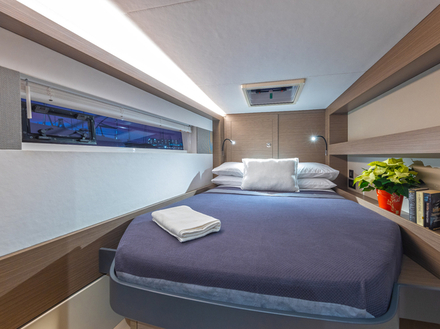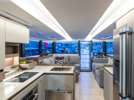 Une fois la large baie vitrée coulissante ouverte, tout le charme du nouveau design contemporain des aménagements Leopard opère. Sur bâbord, la cuisine en L, très équipée, permet d’envisager des croisières véritablement gastronomiques. Sur l’avant, le confort du carré est immédiatement perceptible au regard de la qualité de la sellerie proposée. En vis-à-vis, le poste de pilotage intérieur procure une sécurité maximale, avec une parfaite vision périphérique sur la mer tout en restant à l’abri des éléments.