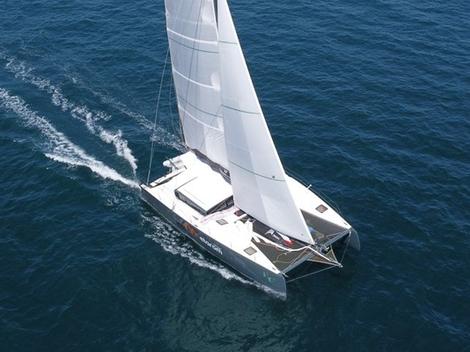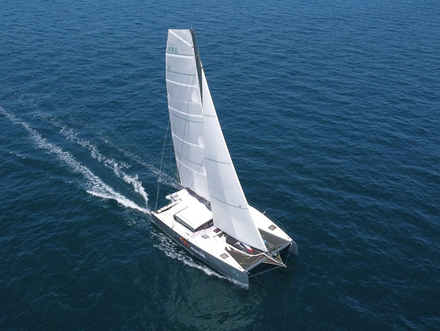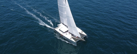 Le plan de pont et l’accastillage délivrent le meilleur de ce que peut offrir la course au large et « donnent envie de régler les voiles », dixit le skipper, qui n’a pas manqué d’en faire la démonstration sur la dernière Route du Rhum. En attendant on continue d’essayer toutes les combinaisons de voiles possibles dans un vent évanescent. A la moindre risée ou voile déroulée, les accélérations sont franches et la vitesse du bateau dépasse très souvent celle du vent. « L’important, c’est d’avoir le bon châssis » nous confie Marc Guillemot les yeux rieurs devant les chiffres des compteurs. Or ici on frise la perfection. Pas le moindre craquement ou grincement dans la nacelle qui intègre une grande table en L, une cuisine face à la route et à bâbord un coin navigation avec la couchette double des propriétaires. Christophe Barreau avait même proposé d’intégrer un cabinet de toilettes dans la nacelle pour tout avoir de plein pied. L’option n’a pas résisté au programme orienté « incentive » du bateau, mais elle aurait tout son sens dans une version 100% usage privé. On accède aux coques depuis l’extérieur, les descentes étant protégées des embruns ou de la pluie par la casquette de roof. L’aménagement des deux coques est rigoureusement symétrique, avec une couchette double centrale au-dessus des moteurs et une salle d’eau arrière. Pas de vaigrages, pas de bois, matelas enlevés on pourrait passer le nettoyeur haute pression ! A l’avant, accessibles uniquement depuis le pont, des couchettes dites « de mouillage », qui permettront d’accueillir un équipage éventuellement plus nombreux le temps d’un weekend. Avec ses nombreux jours fériés, nous sommes plus que prêts à l'essayer beaucoup plus longuement que ce bel après-midi, pourtant déjà mémorable.