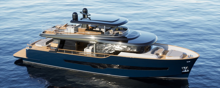 Sur le flybridge - qui demande à être vécu aussi bien au mouillage qu'en mer, offrant de nombreux espaces dédiés à la détente et doté d'un élégant module cuisine avec wet-bar - se distingue un T-Top au design léger. Toute la surface de cette partie est recouverte de panneaux solaires pour alimenter les systèmes de bord. Le garage du tableau arrière peut abriter une annexe de 4 mètres et de nombreux toys.