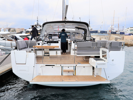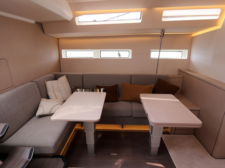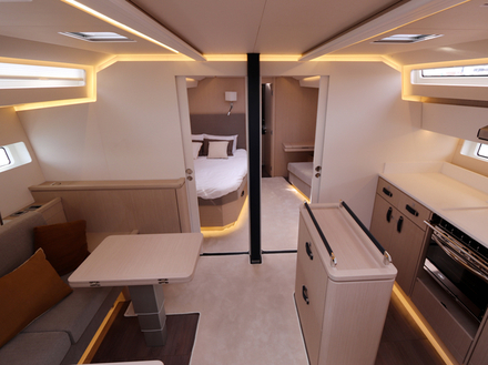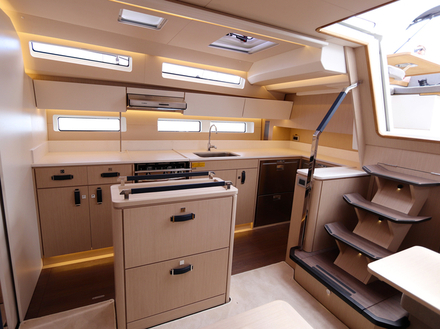 Plus court que ses aînés, ce 55 pieds a poussé son équipe de conception à innover pour donner une réponse vraiment en phase avec une clientèle aux attentes bien analysées. Les propriétaires de Jeanneau Yachts naviguent beaucoup, de jour comme de nuit, le plus souvent en couple. S’ils se font un plaisir d’accueillir famille ou amis une semaine ou deux, cela représente à peine 20 % du temps passé à bord. Alors, fort logiquement, sur ce nouvel opus, deux tiers du volume de la coque sont dédiés aux propriétaires. Les invités ne sont pas négligés pour autant, bien au contraire, puisque le plan d’aménagement bouscule tous les codes établis. La grande suite propriétaire occupe les deux tiers de l'intérieur. La descente principale est située dans l’axe de manière assez conventionnelle. Cet immense espace intègre une grande cabine double à l’avant, avec salle d’eau indépendante bien sûr, s’ouvrant largement sur l’espace de vie. La cuisine avec son îlot central, modernité oblige, est sur tribord avec en vis-à-vis le carré sur bâbord. La finition est soignée, dans le respect de la tradition de qualité des menuiseries Jeanneau, rehaussée de détails chics, telles ces poignées d’équipets en cuir. Le design intérieur, en accord avec le reste de la gamme Jeanneau Yachts, dégage une élégance discrète, parsemée de détails complexes et de textures graphiques. Un design intemporel et fonctionnel. Les espaces lumineux se succèdent de manière transparente et relient tous les différents espaces en un véritable loft.