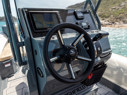 De conception minimaliste, la console des instruments est en carbone. On y trouve le grand écran Garmin Echomap 10’’, la VHF Garmin et l’instrumentation moteur. Le pilote dispose ainsi dans son champ de vision de toutes les informations requises, tant au niveau de la navigation, que de la conduite et du suivi des paramètres moteur.