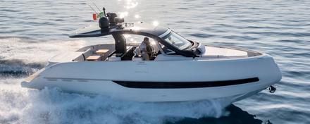 Le profil de l'Invictus TT420, qui reprend les caractéristiques stylistiques de son aîné TT460 se distingue par les traits élégants du pare-brise, qui se fondent parfaitement dans le hardtop en carbone. Le pare-brise en verre intégral avec essuie-glaces, en particulier, représente une solution inhabituelle sur cette taille de bateau et protège pendant la navigation. En même temps, un système d'ouverture à l'avant assure une circulation efficace de l'air au mouillage.