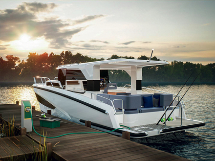 Le chantier finlandais avait présenté cet open de 8 mètres, à petite cabine double pour passer la nuit, en 2021 à Cannes avec un moteur Mercury de 250 cv et une carène à double step ultra performante, pensée également pour l’électrique. Au Yachting de Cannes 2022, c’est donc avec un moteur hors-bord électrique de la marque norvégienne Evoy que l’Axopar 25 fait sa réapparition. Le Storm outbord de 300 cv le propulse à plus de 51 nœuds et les deux batteries Kreisel de 63 kWh chacune lui permettent de parcourir 25 miles à 25 nœuds. 80% de la puissance batterie est rechargeable en 45 minutes ce qui autorise une croisière aller-retour de 40 à 50 milles dans la journée.