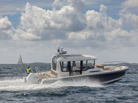 Le plus petit de la série Nimbus Commuter du chantier suédois mesure 7,93 mètres. Il est voué à une utilisation intensive tout au long de l’année et peut être facilement remorqué sur route. Comme pour le C9, la motorisation hors-bord (facilement adaptable) a été retenue avec des Mercury Verado 250 ou 300 cv lui procurant une vitesse maximale de plus de 40 nœuds. La plage avant est modulable de banquette en bain de soleil et la petite cabine permet de prolonger la journée en cas de coup de cœur pour le mouillage.