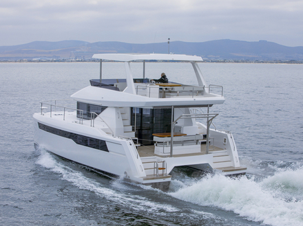 Le fabricant sud-africain renforce sa gamme de Powercat, déjà composée du 46PC et du 53PC, avec un modèle d’entrée de gamme de 12 mètres. Si celui-ci offre une solution plus économique pour la croisière en privé et/ou en location, il est néanmoins pourvu de 3 ou 4 cabines, d’un très beau flybridge et d’un grand salon avec le fameux accès frontal sur la plage avant. Malgré ce format compact, le lien de parenté avec la gamme est préservé par le coup de crayon d’Alexander Simonis, l’architecte. Son confort et ses équipements n’ont rien à envier à ses grands frères, ni même son niveau de finition qui a été repensé à la hausse dans l’ensemble de cette gamme moteur. Le choix de motorisation allant de 2 x 250 à 2 x 370 cv permettra de croiser entre 14 et 18 nœuds avec une vitesse maximale annoncée à 23 nœuds pour la version la plus puissante.
