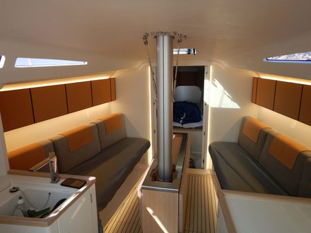 L’agencement intérieur est très aéré, habillé de blanc et moderne, apportant une clarté et un volume surprenant pour un bateau conçu autour du thème de la performance.
