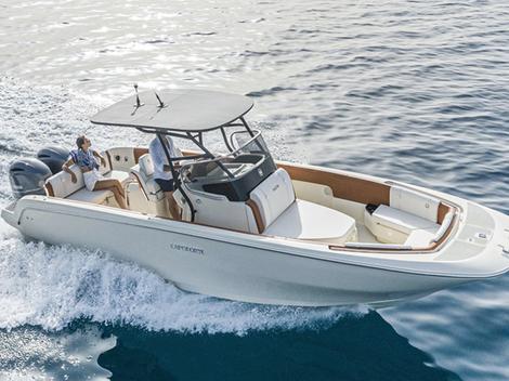 Le FX270 fait partie de la gamme de modèles Capoforte avec moteurs hors-bord (il peut être équipé d'un seul moteur de 350 ch ou de deux moteurs de 150 ch) et présente une "coupe à l'américaine" distinctive, caractérisée par une coque très nette, linéaire et d'inspiration "pêcheur".