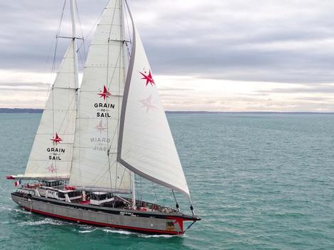 En 2020, le premier voilier cargo (Grain de Sail I) d’une longueur de 24 mètres avait beaucoup impressionné non seulement par sa ligne mais aussi par l’aventure humaine et maritime qu’il proposait. Fort de cette expérience, tout a été mis en œuvre pour la construction de Grain Sail II. Ce nouveau navire d’une longueur de 52 mètres est spécialement conçu pour réduire au maximum les émissions de CO² de plus de 90% grâce à sa propulsion vélique (1500 m² de surface de voile au portant). Pour ce premier voyage, il transportera une gamme variée de marchandises allant de produits finis à des pièces de rechanges. Parmi ceux-ci, nous pouvons citer des cosmétiques, des vins, des équipements de santé (pharmacie et paramédical), des textiles, des parfums, de l’alimentaire, des instruments de musique, etc. … Ces produits, transportés sur des palettes, sont répartis dans quatre cales séparées sur deux niveaux. Pour éviter tout risque de déplacements, les palettes sont sanglées et sécurisées par des coussins gonflables. Pour répondre aux normes, entre autres pour le transport de produits pharmaceutiques, la température dans les cales est régulée entre 15°C et 25°C ainsi que l’hygrométrie.