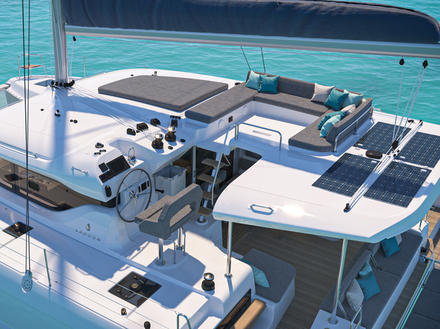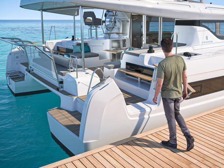 Pour ce nouveau modèle, Lagoon a repensé l'accès au catamaran en créant une ouverture supplémentaire à l'arrière des coques. Cela permet de faciliter la circulation entre le bateau et le quai, un gain de sécurité et de confort. Côté esthétique, ce nouveau modèle garde les points clés de la marque : une circulation à bord parfaitement fluide, des jupes arrières séparées du cockpit par une seule marche, renforçant ainsi la connexion des espaces.