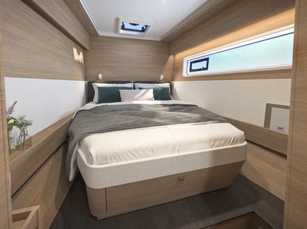 La nouvelle forme de coque du Lagoon 43 offre des volumes généreux ainsi que des dimensions de couchage plus importantes dans toutes les cabines. Cette habitabilité est inédite pour un bateau de cette taille. Au niveau de la cabine propriétaire, un large couchage en pointe avant et une salle d'eau en arrière de la cabine assurent un gain d'espace et de généreux rangements. Cet aménagement est similaire à ceux que l'on peut retrouver sur les plus grands yachts.