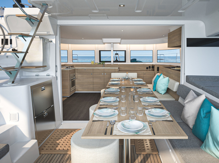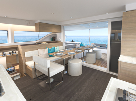 Lagoon a imaginé une nouvelle vision de la vie à bord, présentant un bateau polyvalent aux frontières modulables. Cette avancée rend possible la transformation de l'espace en permettant de lier l'intérieur à l'extérieur au gré des envies entre le carré et le cockpit.