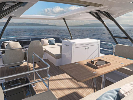 Le flybridge, protégé par un hard-top, offre une véritable terrasse surplombant l'océan. Juste à côté du poste de pilotage et de ses deux fauteuils confortables, des bains de soleil invitent à la détente. Le grand salon extérieur avec sa table à manger facilite les moments de convivialité en extérieur, profitant ainsi de la vue panoramique.