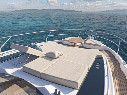 Dotée d'une banquette en forme d'arc de cercle, d'un vaste bain de soleil à dossier ajustable ainsi que d'une table basse amovible, le pont avant de la F5 se transforme en superbe salon lounge. L'endroit idéal pour profiter pleinement de la mer, de ses amis ou simplement pour se détendre.