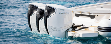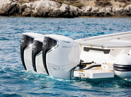 Premier V8 de la gamme, le tout dernier modèle de moteur hors-bord Honda développant 350 cv a été dévoilé en septembre 2023. Au-delà de sa puissance, le design exprime une recherche d’harmonie avec la nature, avec des lignes simples et épurées. « Nous nous sommes inspirés du monde aquatique pour le design du BF350, des vagues et de la surface de l'eau, à la fois douces et lisses, mais en même temps capables d’exprimer toute leur puissance dans des conditions extrêmes. Une vague est agréable à faible intensité ou bien massive et puissante à plus forte amplitude, c’est le parallèle entre le silence à bas régime et le couple déployé. Son design athlétique et robuste se décline d’une musculature de baleine, l’animal aquatique le plus imposant du milieu aquatique. La conception des persiennes d'admission s'inspire de la beauté des reflets des vagues qui deviennent progressivement de plus en plus fines, s'entrelaçant délicatement les unes dans les autres avec élégance » témoigne Masato Fujiwara, le designer.