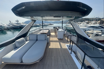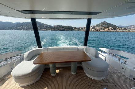 Son accès se fait par un large escalier en courbe. Le hard-top protégeant le flybridge est équipé d’un toit ouvrant électrique. Sur la section arrière, on trouve un grand bain de soleil pour deux personnes. Au centre à bâbord, se situe une banquette en U (toujours en Batyline gris clair) pouvant accueillir aisément huit personnes autour d’une table en bois, avec une vue panoramique splendide pour un repas ou un apéritif de fin de journée. En face sur tribord, un élégant meuble intègre un évier, une plancha ou feux selon les options, et un frigo.
