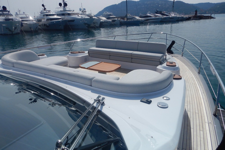 Élément particulièrement réussi de l’Azimut Fly 72 : le flybridge, qui impressionne par sa surface, sa conception sur un seul niveau, et sa bonne intégration aux lignes du bateau.