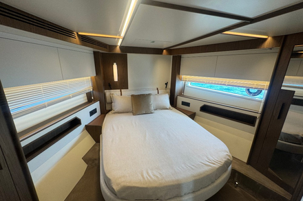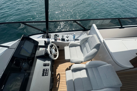 Le poste de pilotage du flybridge se situe à l’avant tribord et comporte deux sièges ergonomiques avec bolsters. Toutes les informations requises pour la navigation et le contrôle des moteurs sont accessibles avec deux grands écrans Raymarine bien visibles, et deux écrans de contrôle dédiés aux deux moteurs MAN. Un joystick est présent pour les manoeuvres portuaires avec une vision à 360°. En vis-à-vis du poste de pilotage, sur bâbord, un grand espace plage de bain est aménagé pour deux personnes.