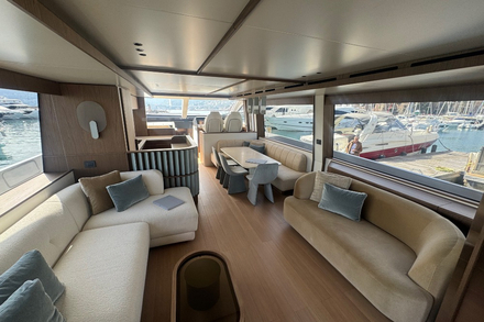 L’accès à l’intérieur du navire s’effectue par une baie vitrée coulissante en avant du cockpit. On découvre alors un espace sur un seul niveau, sans surbau ou marche. Une impression de profondeur et de clarté se dégage et apporte un cachet esthétique spectaculaire. Cet effet est dû aux très grandes fenêtres qui habillent la quasi-totalité de l’espace, une belle prouesse structurelle et une vision panoramique exceptionnelle. Le mixte des matériaux est très réussi du fait d’une alliance entre bois clair (parquet et certaines cloisons) et matériaux modernes (vaigrage et habillage de cloisons).