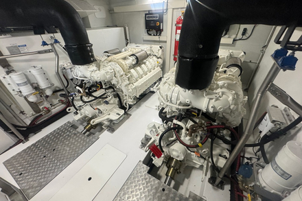 Comme l’ensemble de l’Azimut 72 Fly, la salle des machines est particulièrement soignée, avec une intégration des appareils et des systèmes très réussie, et des accès simples pour la maintenance courante des moteurs, groupes électrogènes, groupe de climatisation, etc. Les deux moteurs MAN CR V12 développent chacun 1 400 cv, apportant de très bonnes performances en mer sur lesquelles nous reviendrons lors des essais en mer. Les réservoirs de gasoil d’une capacité unitaire de 2 600 litres sont situés de chaque côté du compartiment moteurs et assurent une bonne autonomie pour envisager de longues croisières ou traversées. La transmission se fait par lignes d’arbre. Cette configuration associée aux deux propulseurs (avant et arrière) de type proportionnel donnent une manoeuvrabilité excellente lorsque l’ensemble est piloté par l’un des trois joysticks présents (timonerie intérieure, flybridge et cockpit arrière). L’énergie à bord est assurée par deux groupes électrogènes Mase VS22 low (2 x 20 kW) dans des cocons bien insonorisés, le niveau sonore est très faible. La présence d’un stabilisateur de type Seakeeper 18 assure une très bonne stabilité au navire, tant en mer qu’au mouillage. La climatisation est assurée par un groupe Dometic nouvelle génération de 120 000 btu, puissance correctement dimensionnée pour les volumes du navire.