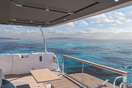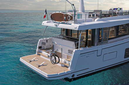 Parmi les caractéristiques extérieures du bateau, vous trouverez un cockpit avec vue sur mer ainsi qu'un vaste flybridge aux assises confortables pour des moments de partage ou de relaxation. La circulation est complètement revue avec un poste de pilotage situé au centre de l’espace. Cette configuration permet un accès rapide et facile vers les portes latérales de la cuisine et de la timonerie, les escaliers de flybridge et d’accès au pont inférieur ainsi que les portes de coupée et la plateforme arrière. L’arrière du bateau est équipé d'un tenderlift de 400 kg, de plusieurs rangements pour les kayaks ou les planches de stand up paddle, ainsi que d'une plateforme de bain hydraulique avec supports d’annexe intégrés. Le pont avant offre 2 possibilités d’utilisation : un large bain de soleil et un espace convivial avec table en intégrant toujours du rangement pour les amarres et pare battages.
