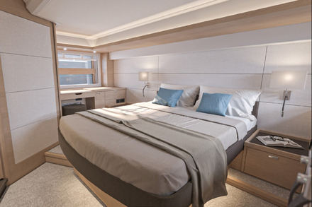 Construit avec six couchettes, et une couchette simple supplémentaire pour l'équipage en option, l'aménagement est parfait pour de longues croisières en famille. La cabine propriétaire est dotée d’une grande salle d’eau privative, contenant une large douche séparée, des toilettes et de multiples rangements. Une seconde salle d’eau est accessible depuis les autres cabines et les espaces communs. Toutes les cabines sont équipées de penderies avec des portes à lattes pour assurer une bonne ventilation du linge. Pour réduire les nuisances sonores, les moquettes sont composées de sous-couches acoustiques et les cloisons de panneaux en mousse.