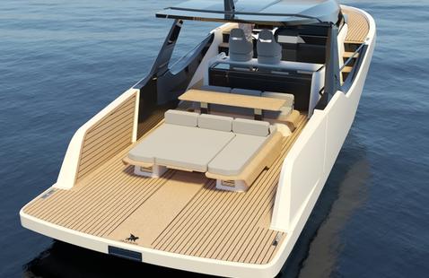 Le cockpit est conçu pour être modulable. Il dispose de terrasses ouvrantes de chaque côté, permettant d’augmenter l’espace disponible à bord, ce qui est rare pour un bateau de cette taille. Les canapés sont équipés de dossiers mobiles et d'une table centrale qui se transforme en un grand bain de soleil, créant ainsi un espace central idéal pour la détente. Avec la poupe dégagée, cet espace devient un véritable lieu de vie pour les invités ou les enfants, tout en optimisant la circulation à bord.