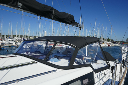 Ce concept est né d’une envie d’offrir une capote design entièrement modulable, légère et peu encombrante sur le roof à l’instar des grandes capotes enveloppantes. Le produit retenu pour la conception de la structure est : l’aluminium anodisé. Ce matériau est intéressant par son côté lisse et apporte à la fois de la modernité et de la légèreté avec la possibilité de le laquer pour le personnaliser. Quant aux toiles, elles se déclinent en 3 jeux : Batyline blanche à toile ajourée, Soltis 86 blanche à trame fermée et Soltis 90 blanche à trame ouverte pour laisser passer l’air et la lumière. Les capotes sont équipées de poches latérales en grille, d’un vitrage de toit, d’un à l’avant ouvrant et de joues de côté. Ce vitrage dénommé Cristal est utilisé pour sa tenue en mer, sa souplesse, sa résistance et sa possibilité d’être roulé. Pour la facilité de montage/démontage, les liaisons platine/arceau se font avec des axes imperdables.
