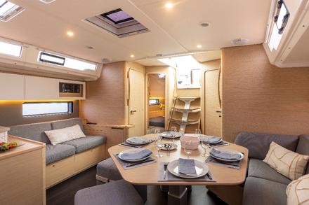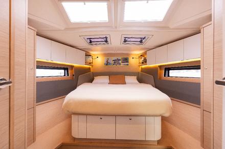 Le dernier né du chantier rochelais est bien un bateau de moins de 13 mètres (12,23 m de longueur à la flottaison), mais en embarquant à bord du Dufour 44, on a l’impression d’être sur un 50 pieds ! Le volume, la sensation d’espace, le cockpit, la cabine propriétaire XXL et la vue sur mer depuis les cabines ou du carré, tout a été imaginé pour en donner bien plus que ne pouvait offrir le Dufour 430 que le nouveau 44 remplace dans la gamme. On retrouve ce choix du chantier dans les salles de bains - deux à bord - qui offrent des espaces douche/WC séparés. Pas mal sur un bateau de cette taille.