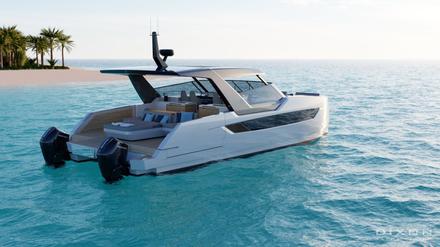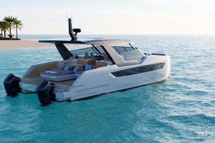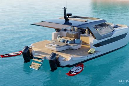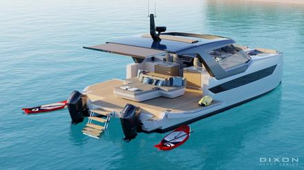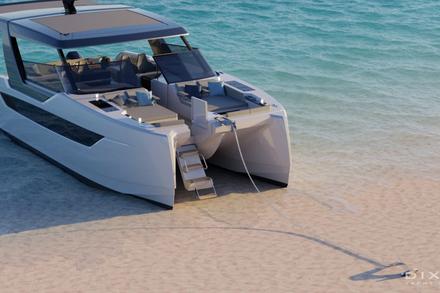 Conçu en Afrique du Sud (comme la gamme de catamarans à voile du constructeur), le nouveau Xquisite 40? PowerCat a été imaginé en collaboration avec Dixon Yacht Design pour créer le « cabin cruiser » idéal. L’objectif à bord de ce 40 pieds novateur est de pouvoir aller passer le week-end ou même la semaine à explorer les eaux des Bahamas (ou des îles méditerranéennes). Pour répondre à ce cahier des charges, un gros travail a été fait sur les carènes pour offrir performances, vitesse en navigation (estimée entre 30 et 38 noeuds) et un faible tirant d’eau permettant de mouiller au plus près des plages, qu’il sera facile de rejoindre grâce à un ingénieux escalier avant monté sur hydraulique.