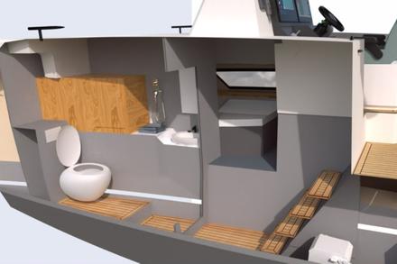 Pour les aménagements, on retrouve une cabine avec sa salle de bains dans chaque coque, et des espaces de vie bien séparés sur la plateforme, agrémentés de larges passavants basculants à l’arrière.