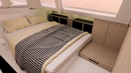 La spécificité du chantier- depuis le tout premier des trimarans Neel - est de proposer une cabine propriétaire au même niveau que l’espace carré/cockpit. Une cabine avec sa salle de bain privative et une vue somptueuse sur le mouillage. Facile d’accès, elle est unanimement appréciée par les propriétaires. Dans le Neel 43 « classique » les deux autres cabines sont disposées, l’une dans la pointe avant et l’autre à bâbord en contrebas et en relation directe avec le carré, sans trop d’intimité. Idéal pour une famille avec de jeunes enfants, la configuration du 43 ne correspond pas, en revanche, à une utilisation avec deux couples ou avec des enfants/adolescents souhaitant plus d’intimité.