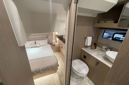 La Prestige F4.3 est pensée pour des séjours prolongés en mer, avec des cabines spacieuses et bien aménagées. La Master suite, située au centre du bateau, offre un confort remarquable : grand lit, rangements astucieux, dressing et une décoration raffinée jouant sur les matériaux nobles et les éclairages subtils.