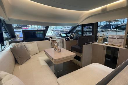 La conception intérieure de la Prestige F4.3 mise sur un équilibre entre confort et modernité. Son salon intérieur, enveloppant le poste de pilotage, bénéficie d’une excellente ventilation grâce à des fenêtres ouvrantes latérales et d’une luminosité naturelle grâce aux larges baies vitrées.