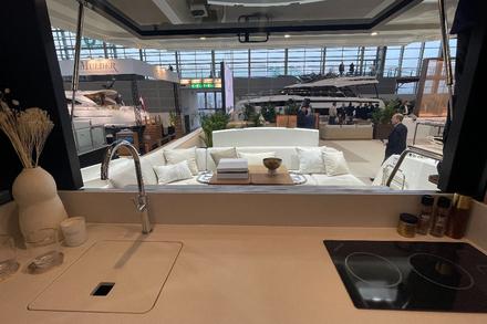 La cuisine, nommée Ocean View Galley, s’intègre parfaitement au cockpit avec son ouverture directe sur l’extérieur. Cet agencement permet de cuisiner tout en restant en interaction avec les invités. L’espace est modulable et bien équipé, avec des options haut de gamme comme une cave à vin et des plans de travail élargis.