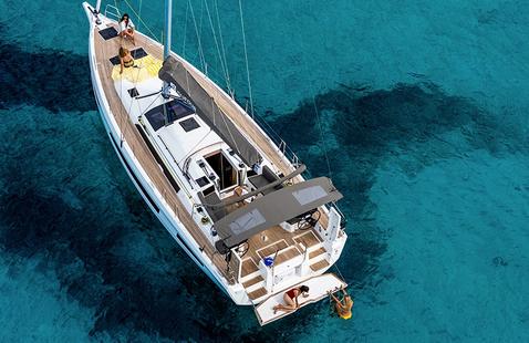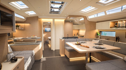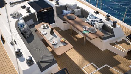 Pour dessiner son nouveau bateau amiral, le chantier a logiquement choisi de faire confiance à l’architecte naval Umberto Felci (qui dessine, entre autres, les bateaux Dufour depuis plus de 20 ans) et au designer d’intérieur Luca Ardizio. Le résultat est un bateau qui fait la part belle à la vie au grand air, avec différents lieux de vie pour profiter à la fois des navigations, en étant bien protégé dans le cockpit et du mouillage, avec des espaces de farniente.
