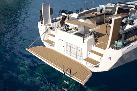 L’idée principale sur le 54 est de proposer une connexion permanente à l’océan. Et forcément, la plateforme arrière est, à ce titre, particulièrement importante. On y trouve une surface importante avec une cuisine extérieure (équipée en option d’une planche toujours très appréciée des équipages). Mais si vous avez d’autres idées en tête, le chantier est prêt à vous suivre, puisque cet espace peut être aménagé comme vous le souhaitez. Enfin, la plateforme arrière est le lien entre l’océan et le bateau grâce à un double accès au cockpit pour faciliter les déplacements à bord.