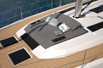 Mais ce cockpit, s’il est l’élément central de la vie à bord n’est pas le seul lieu de farniente. A l’avant, Dufour propose un « Sky Lounge Deck » : un véritable cockpit avant ! Situé à l’avant du roof, on y trouve un grand bain de soleil pour deux personnes, dont les assises se relèvent. De vraies chaises longues pour profiter de la navigation, observer ou se détendre.