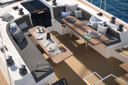 Le cockpit est ingénieusement dessiné pour offrir espace et convivialité, en navigation comme au mouillage. Sa forme en U permet au barreur de rester tout le temps au contact de ses équipiers. La communication en est grandement facilitée. Un plus lors des manoeuvres ou tout simplement pour profiter du moment tous ensemble. Autre avantage de ce cockpit dénommé « Sky Lounge Cockpit », les deux tables s’abaissent facilement pour former deux bains de soleil très confortables. « The place to be » lors des navigations, bien protégé par le roof et à l’ombre des voiles ou d’un hard top que le chantier a bien évidemment prévu en option.