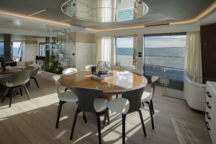 À l’intérieur, l’aménagement est entièrement personnalisable. Le propriétaire peut moduler les espaces selon ses envies, avec de grandes cabines invitées, toutes équipées de leur propre salle d’eau, et une suite propriétaire pensée comme un appartement privé. L’optimisation des rangements, l’attention portée à l’ergonomie et la circulation fluide entre les zones rendent l’ensemble à la fois pratique et accueillant.