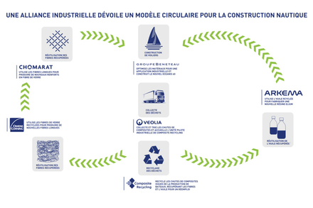 Le projet réunit six entreprises leaders : Arkema, Veolia, Composite Recycling, Owens Corning, Chomarat et le Groupe BENETEAU, toutes impliquées dans la création d’un modèle complet d’économie circulaire appliqué aux matériaux composites. Ensemble, elles ont mis en place une boucle industrielle désormais opérationnelle, permettant la fabrication en série de bateaux intégrant des matières premières recyclées.