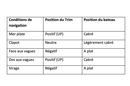 Il n’y a pas de règle générale, chaque bateau est un cas particulier. Une prise en mains s’impose : naviguez sur un plan d’eau calme et essayez les différents réglages de Trim au déjaugeage, à différentes vitesses et en virage. Ensuite, faites des essais dans différentes conditions de mer. Un Trim bien réglé est non seulement un gage de sécurité et de confort mais aussi une optimisation de la consommation de carburant. Un moteur bien réglé en inclinaison permet de réduire le régime moteur de plusieurs centaines de tours minutes tout en gardant la même vitesse. L’indicateur de position de Trim est utile pour reprendre les bons réglages, en particulier, lorsque vous confiez la barre à une personne ne connaissant pas le bateau.