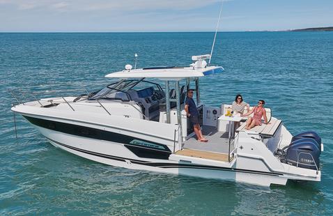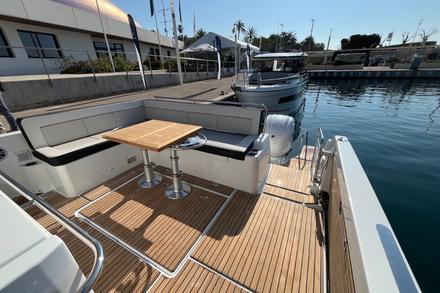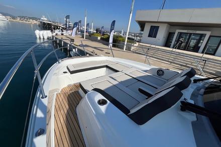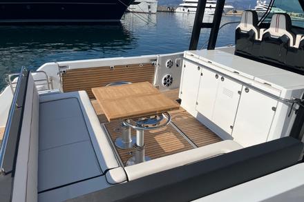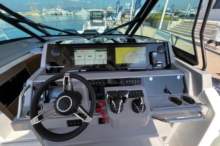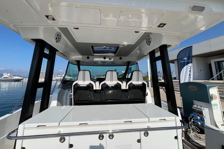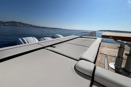 Le père de famille s’installe au poste de pilotage, protégé par un grand pare-brise. Trois sièges ergonomiques avec sellerie haut de gamme, deux écrans Garmin ultra lisibles : le départ se fait tout en douceur. Les enfants surveillent la navigation depuis la banquette avant. Le bateau plane rapidement, sans forcer. 30 noeuds confort, et une carène développée par Michael Peters qui avale le clapot avec une grande douceur. Mais ici, ce n’est pas la vitesse qui compte : c’est le confort, l’espace, et la sérénité.