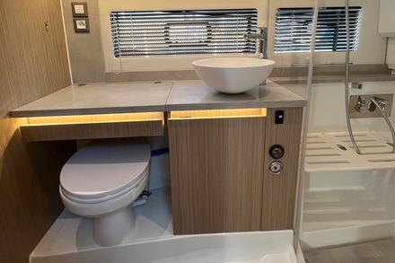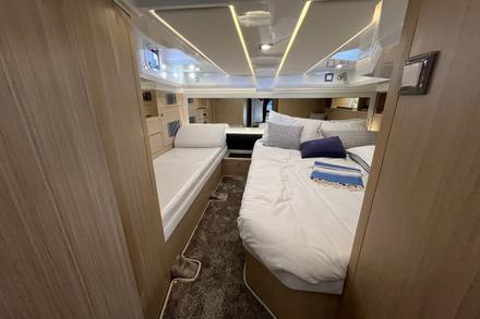 La cabine avant transformable offre un vrai coin de repos. La salle d’eau, avec douche séparée, est parfaite pour se rincer. Le toit ouvrant électrique du T-Top laisse passer une brise agréable. Le bateau est à l’arrêt, mais reste un véritable cocon flottant. Un petit bruit se fait entendre - l’extracteur d’air des cales - un point que le chantier envisage d’améliorer.