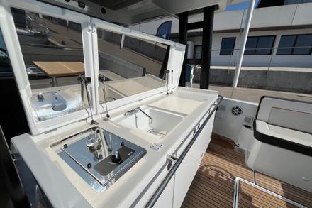 La crique est déserte. Ancrage en quelques secondes, baignade depuis la plateforme bâbord. Tandis que les enfants explorent les fonds marins, le barbecue s’active à l’arrière. Le leaning-post tout équipé devient une vraie cuisine extérieure. La banquette du cockpit est réinstallée en un clin d’oeil. On est bien. Les enfants se reposent dans la cabine arrière (une couchette double, une simple), pendant que les parents prennent un café à l’avant, sur la banquette complétant le double bain de soleil. Côté bâbord, la mini terrasse s’ouvre électriquement, avec sa filière de sécurité et son échelle amovible : une véritable terrasse sur la mer. À bord, tout est calme.