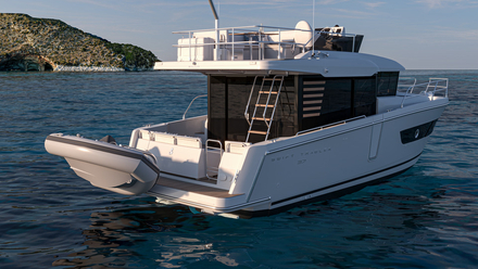 Deux versions sont proposées : Sedan ou Flybridge. La version Flybridge mise sur la visibilité et la convivialité, avec une timonerie offrant une large vue latérale, une banquette en U avec dossier réversible vers l’avant, une table et un réfrigérateur. De son côté, la version Sedan introduit un nouveau concept d’espace adaptatif, pensé pour s’adapter à tous les styles de vie, qu'ils soient actifs ou plus détendus. Chaque configuration propose un vaste volume de rangement pour accueillir les équipements de loisirs.