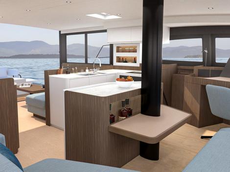 À bâbord, le carré adopte un style lounge avec des assises profondes et une table modulable, qui se transforme selon les besoins en lit, coin repas, table basse ou poste de travail. La cuisine, véritable cœur de la vie à bord, gagne 15 % de surface de travail grâce à un îlot central élargi, une tablette escamotable et des rangements mieux pensés, le tout face à l’horizon pour cuisiner avec vue sur la mer. Le salon central, plus cosy, offre une assise cocooning avec une vue directe sur une table à cartes modernisée, permettant de garder le lien avec l’ensemble du carré.