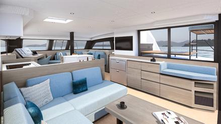 Pour ce nouveau millésime, Catana s’est entouré du cabinet Piaton & Bercault afin de repenser les aménagements intérieurs. Les espaces de vie gagnent en harmonie et en chaleur avec de nouvelles essences de bois et des tissus contemporains. L’objectif est clair : créer une atmosphère élégante et agréable à vivre, sans compromis sur la praticité. Chaque détail a été revu pour améliorer l’ergonomie. La baie vitrée arrière s’ouvre désormais plus largement, abolissant la frontière entre cockpit et carré et offrant une vraie sensation de volume. Un meuble prolongé d’une banquette relie poste de barre et cockpit arrière, facilitant les déplacements et ajoutant de la fonctionnalité.