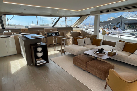 Autres options disponibles : un poste de barre intérieur - très utile en voyage et en navigation familiale - et un package baptisé « Silent Mode », une solution pour avoir tout le confort à bord pendant 12 heures sans émettre - ou quasiment pas - d’émissions d’équivalent CO2. Ce pack se compose de panneaux solaires sur le flybridge, le hardtop et le pont (2,6 kW), un parc de batteries Lithium plus important, un groupe électrogène de 27 KVA et un convertisseur plus puissant (24V / 230V / 5Kw) et d’une capacité accrue des réservoirs d’eau chaude.