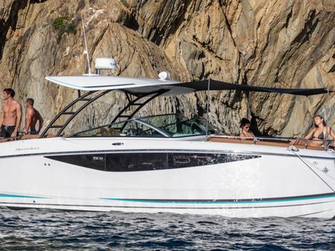 Le cockpit est un autre point fort du TH33. Le pilote profite d’un double siège orienté vers l’avant, accompagné d’un passager qui peut suivre activement la navigation grâce à un écran dédié de 7 pouces. Deux écrans Garmin de 12 pouces trônent sur le tableau de bord, avec des commandes intuitives, une excellente visibilité et une ergonomie moderne. Le pare-brise signature de la marque, intégral et galbé, offre une vraie protection contre les embruns et le vent. Un toit rigide optionnel permet même de profiter de la mer toute l’année, quelles que soient les conditions météo.